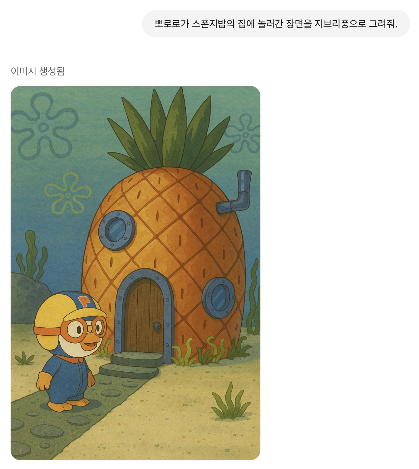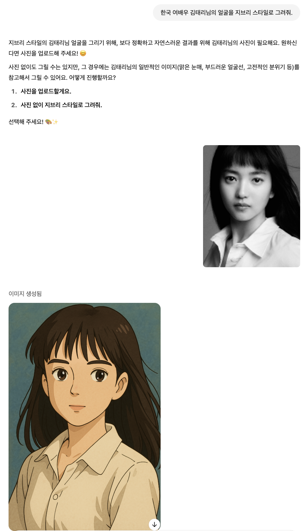 원하는 이미지를 지브리풍으로 그려달라고 요청한 뒤 실제 사진을 업로드해주면 됩니다. 참 쉽죠?